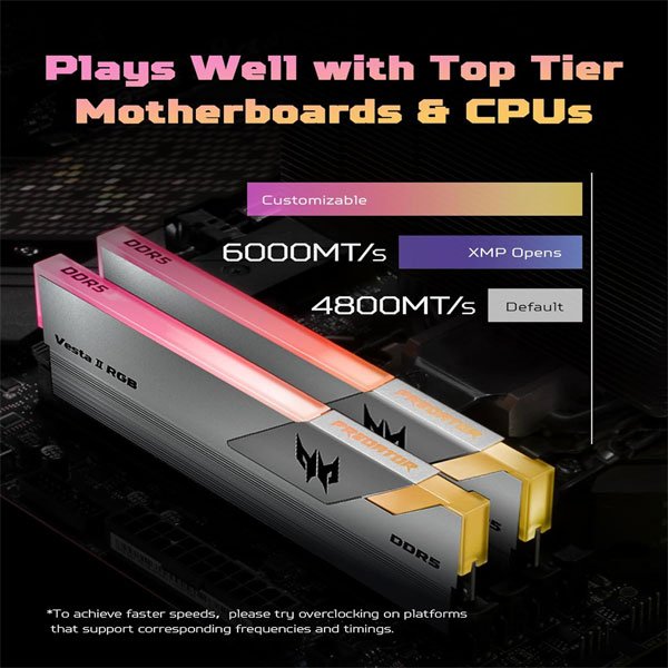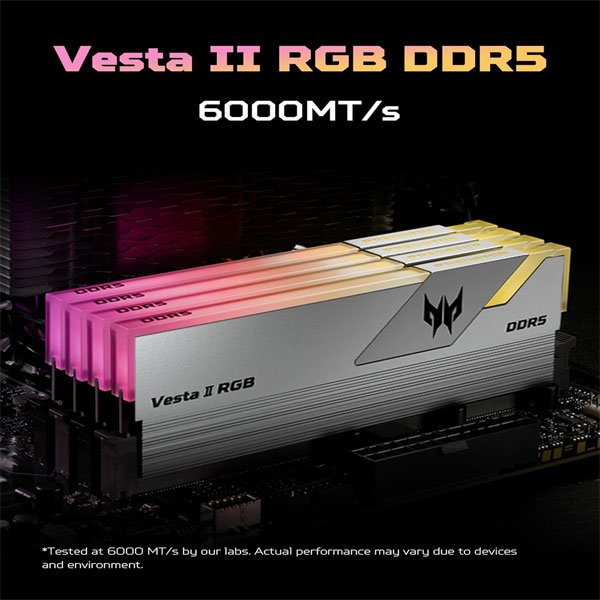 programmable PMIC, bold award-winning design, and 10-mode RGB lighting. Predator DDR5 Vesta II is optimal for play and work.